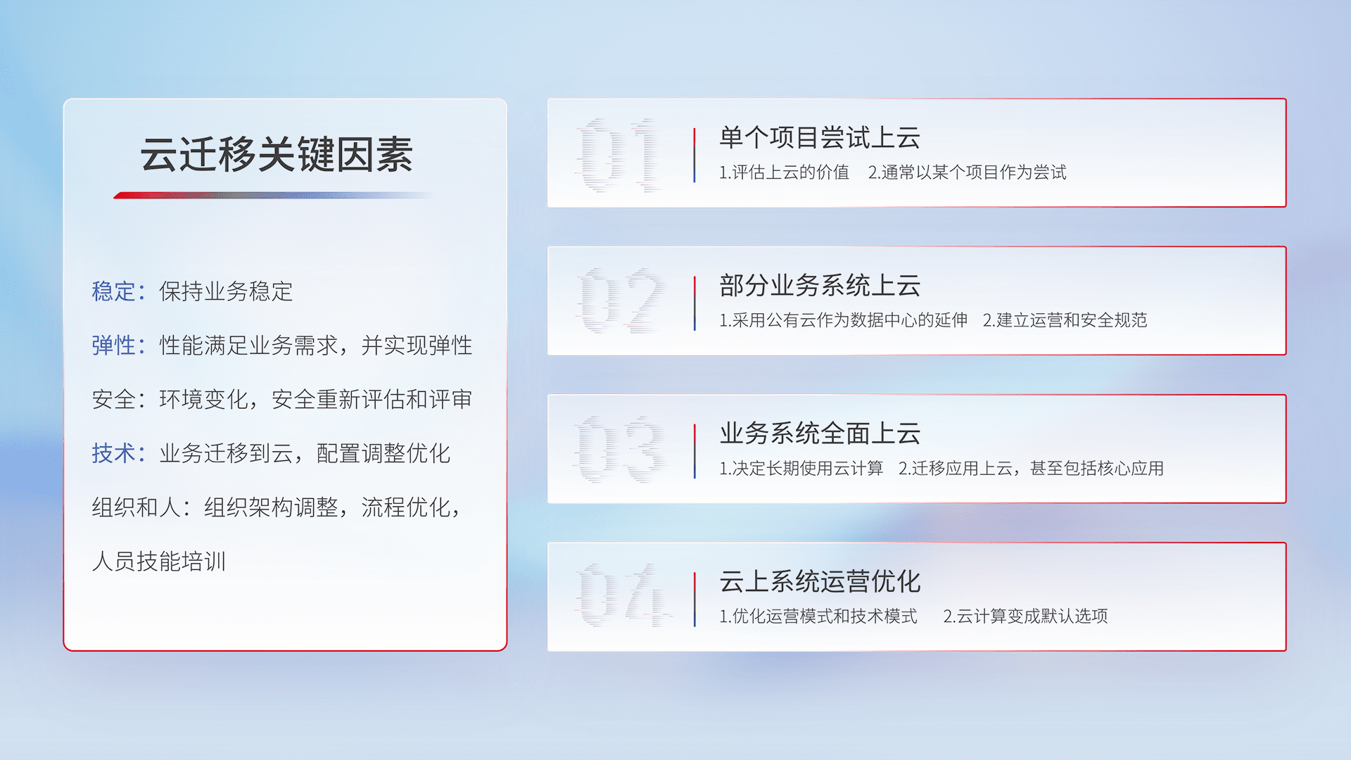 结合实际业务,,,从规划设计、、、云平台选型、、、云原生改造、、数据迁移、、集成交付,,,迁移全过程为客户识别最佳上云路径,,,做好风险识别管理,,,,设计网络架构、、、身份权限、、、、安全审计合规、、、操作审计、、、日志审计、、监控告警策略、、、多站点容灾设计等,,,,对云上基础设施进行整体规划,,提升IT治理水平,,,,以满足弹性、、高可用、、高性能的需求。。